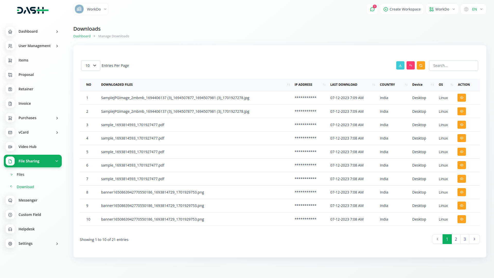 In file download management, you can know and view file name, IP address, date, country, device, OS etc. when a file is downloaded.